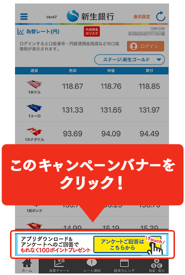 - 「キャンペーン専用アンケートページ」は、「新生銀行外貨預金アプリ」内のキャンペーンバナーをクリックすると表示されます。