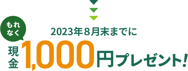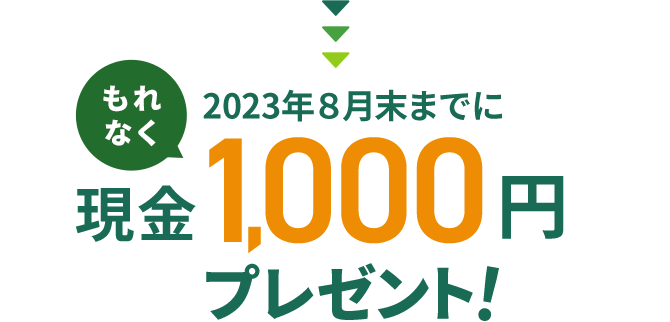 キャンペーン期間中、以下の【個別条件】(A)(B)のいずれかの条件を満たし、2023年7月31日時点で以下の【共通条件】をすべて満たすと、2023年8月末までにもれなく現金1,000円をプレゼントいたします。