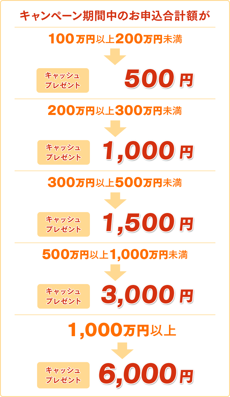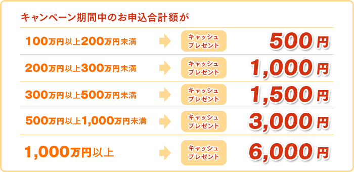 キャンペーン期間中に、インターネット(パワーダイレクト)またはお電話(パワーコール)にて、パワーステップアップ預金2をお預け入れいただいた方に、お取引金額の合計額に応じて後日キャッシュプレゼントいたします。