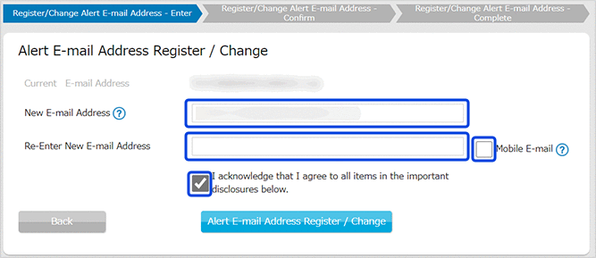 Please enter your E-mail address to "New E-mail Address" and "Re-Enter" field, and please tick "I acknowledge that I agree to all items in the important disclosures below."