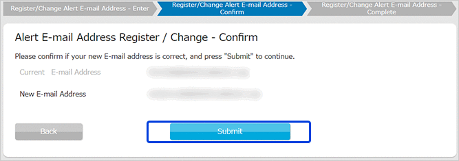Please click "Alert E-mail Address Register/Change" after confirmed your new E-mail address is correct.