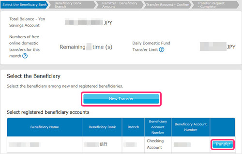 Please select the beneficiary. If you are transferring to a registered account, please select the beneficiary from the registered beneficiary accounts. Otherwise, please click on"New Transfer".