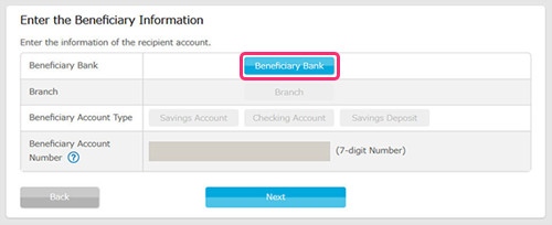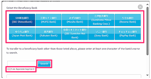 Select"Beneficiary Bank"from the list. If your beneficiary bank is not on the list, please enter one or more characters of the financial institution’s name and click "Search". For example, for "SBI Shinsei Bank,’" you could enter "S". (You can search using full-width hiragana, full-width katakana, full-width English letters, and kanji.) If you have trouble entering hiragana, please click on "Use Japanese Keyboard".