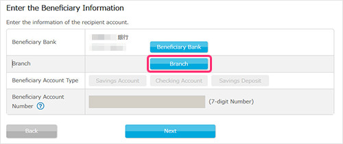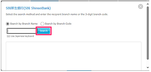 Select the search method, then enter at least one character of the recipient’s branch name or a three-digit branch code. After entering the information, press the "Search"button.