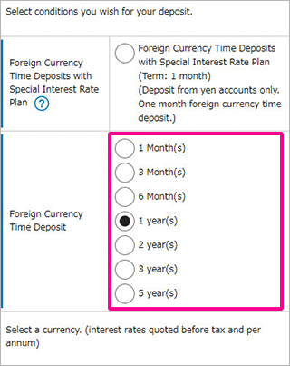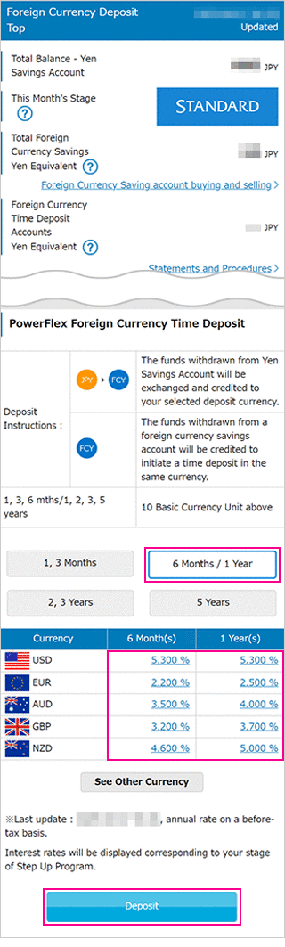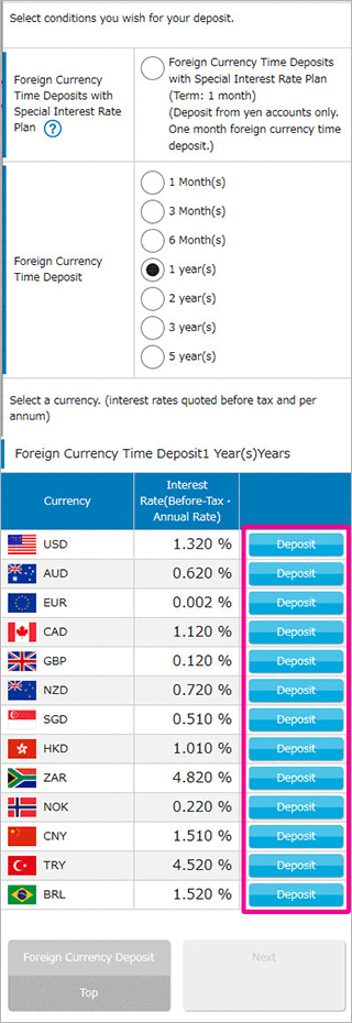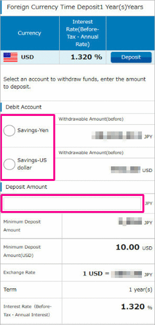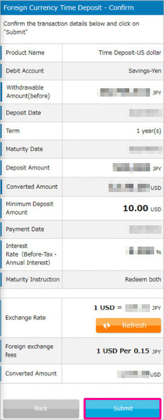 Please confirm the transaction details (interest rate, term, etc.) and make sure to confirm the applicable exchange rate when depositing from your Yen savings account before tapping on "Submit".