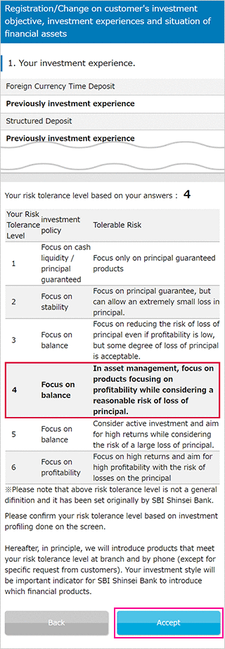 Confirm the information entered and your Risk Tolerance Level shown below and tap "Accept". If "6. Attitude toward investment" on "customer's investment objective, investment experiences and situation of financial assets" is registered as "I only want to have capital-safe product", you will not be able to apply for this financial product.
