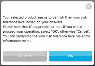 If the risk level for the financial product you are planning to purchase is above your risk tolerance level you have registered on "customer's investment objective, investment experiences and situation of financial assets", an alert message such as the one shown on the right will appear.