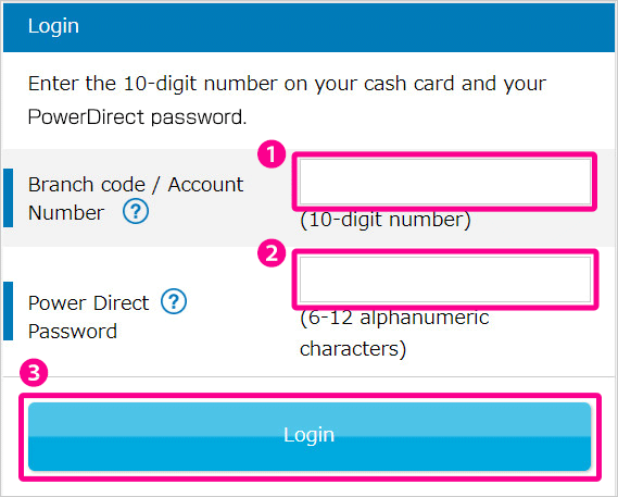 Input the 10-digit number embossed on your cash card (3-digit branch number and 7-digit account number)
