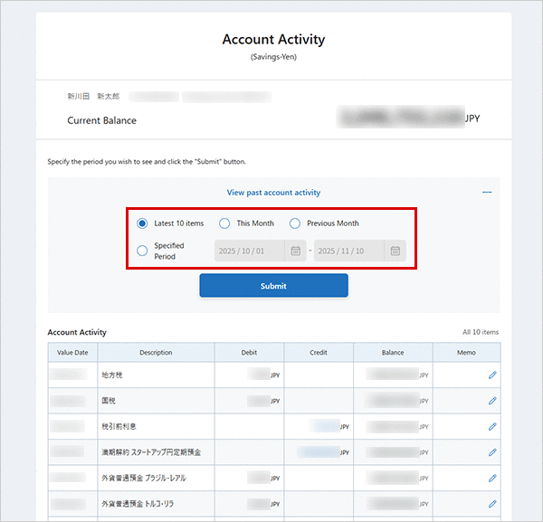 Specify the period you would like to see and click"Submit".Then you can see the list of the transactions you have chosen.
