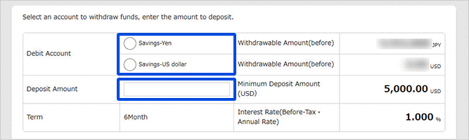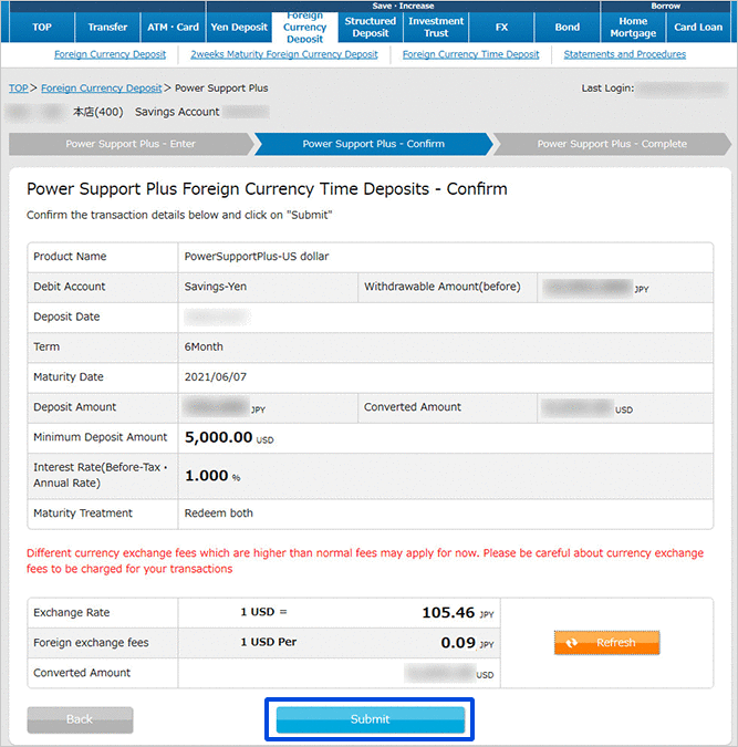 Please confirm the transaction details (interest rate, term, etc.) and make sure to confirm the applicable exchange rate when depositing from your Yen savings account before clicking on "Submit".