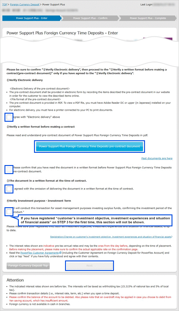 Please confirm all the information shown on the page. If you agree, please tick all the check boxes. You cannot proceed without reading "Power Support Plus Foreign Currency Time Deposits pre-contract document".