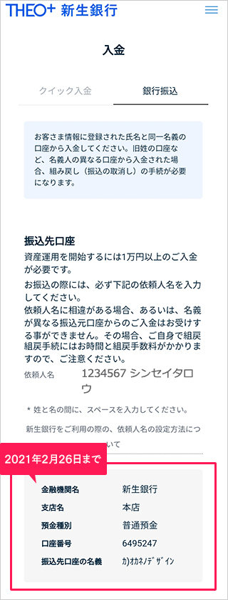 - 支店名、口座番号はTHEO+[テオプラス]新生銀行サイト内でご確認ください