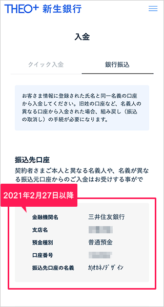 既報(「THEO+[テオプラス]新生銀行 クイック入金対応開始と銀行振込口座の変更について」)の通り、2021年2月27日から、THEO+[テオプラス]新生銀行でご利用いただいている運用資金の銀行振込口座について以下の通り変更いたしますのでお知らせいたします。