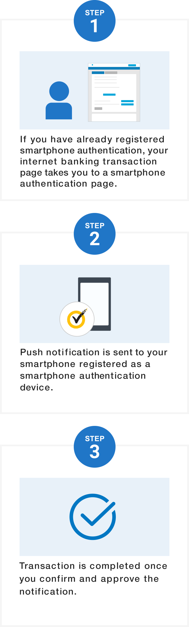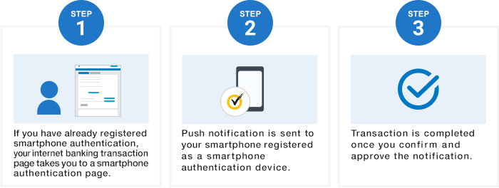 Smartphone authentication is available for customers who have registered it in advance. Transactions are completed once customers approve a push notification sent to their smartphone registered as an authentication terminal.