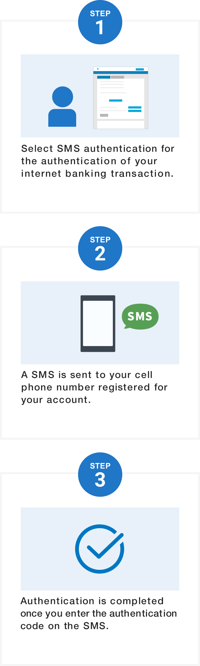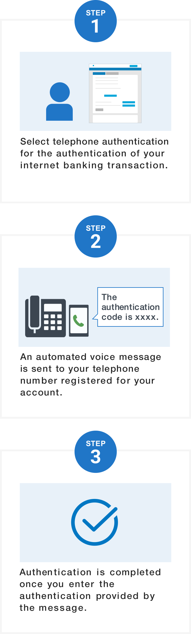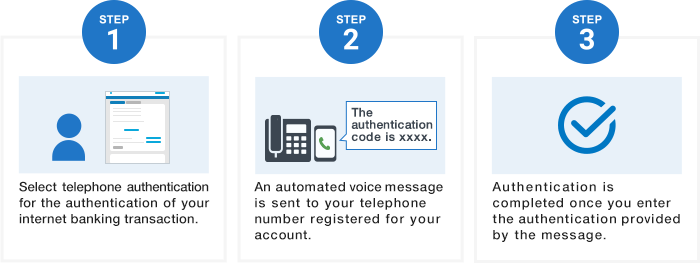 Customers who have not registered smartphone authentication must select either SMS authentication or telephone authentication at the time of target internet banking transactions. SMS authentication sends a SMS with an authentication code to your cell phone number registered for your account, and authentication is completed once you enter the code. Telephone authentication provides an authentication code through an automated voice message to your telephone number registered for your account, and authentication is completed once you enter the code.