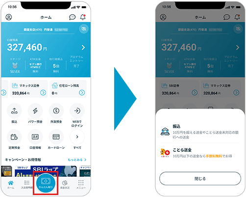 ▼ホーム画面の「かんたん取引」ボタンから「振込」と「ことら送金」を選択できるようになりました。
