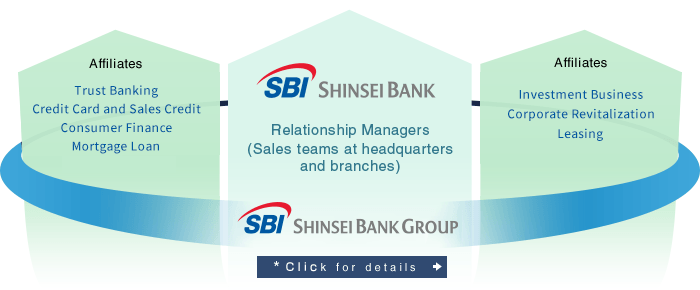 Through the collaboration of the Bank's customer representatives, know as Relationship Managers, its experienced product experts, and its unique Group companies, SBI Shinsei Bank will offer and provide clients with ideal solutions that satisfy their diverse needs.