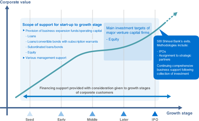 SBI Shinsei Bank offers venture companies with growth potential that have innovative technologies or superior business models custom-made financial solutions (loans, loans with warrants, convertible bonds, subordinated loans, equity such as classified shares and shares) corresponding to their growth stages. We also provide management solutions such as business strategy design and implementation support. By offering these solutions, we look to contribute to maximizing the growth of our customers.