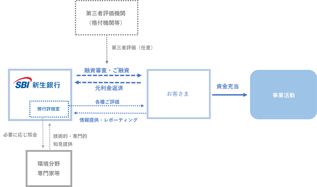 サステナブルファイナンス/インパクトファイナンスでは、通常の融資審査に加えて、専門部署であるサステナブルインパクト推進部サステナブルインパクト評価室が各商品の所定のサステナビリティ要件に沿った評価を行います。サステナブルインパクト評価室は、営業関連部署をはじめとするSBI新生銀行内の各部署から独立しており、技術的な評価が必要となる場合などには、必要に応じて環境分野等の外部専門家のアドバイスも得て評価を行います。