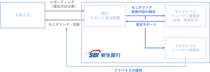 ポジティブ・インパクト・ファイナンスの実行後、ファイナンスの期間にわたり、フロント担当部署は設定したKPIの進捗状況を確認するなど、インパクトの発現状況をモニタリングし、お客さまのインパクトマネジメントのお取組みに伴走します。サステナブルインパクト評価室は、必要に応じてお取組みのさらなる改善に向けたアドバイスを提供します。