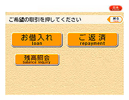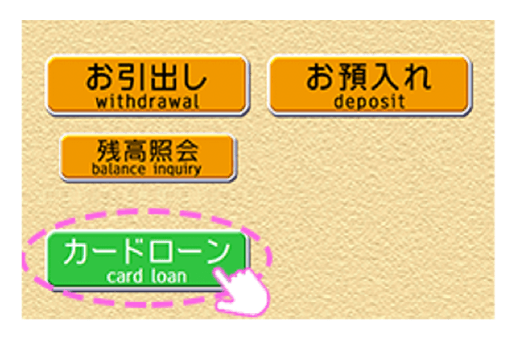 カードを挿入後は、画面左下の「カードローン」のボタンを押していただきますと、お取り引き画面に遷移致します。