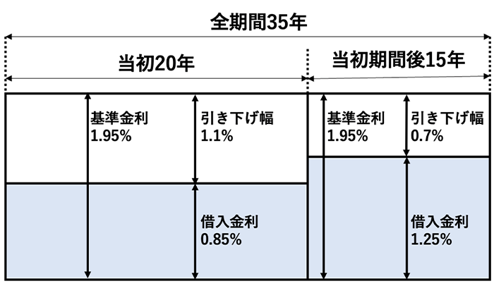 固定期間選択型の借入期間は最長35年とされているのが一般的ですが、返済期間のうち当初20年間の金利が比較的優遇された金利で固定されています。