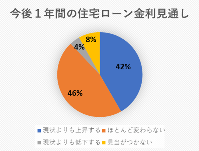 ただ、現状において固定金利を選ぶ方々は、変動金利を選ぶ方々よりも少数派だといえます。住宅金融支援機構が2022年10月に行った「住宅ローン利用者の実態調査」によると、住宅ローン利用者は今後1年間の住宅ローン金利について以下のように考えているようです。