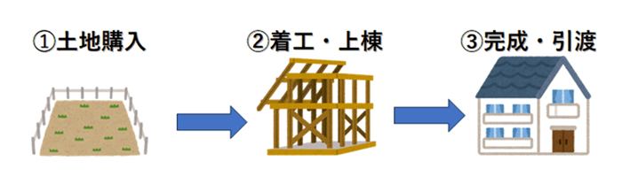 一般的に、住宅ローンは建物が完成し、物件の引き渡し時に実行されるため、土地購入〜着工・上棟時に必要な資金は、手持ちの預貯金またはつなぎローンで準備するのが一般的です。つなぎローンの借入金は、住宅ローンの借入金で一括返済します。
