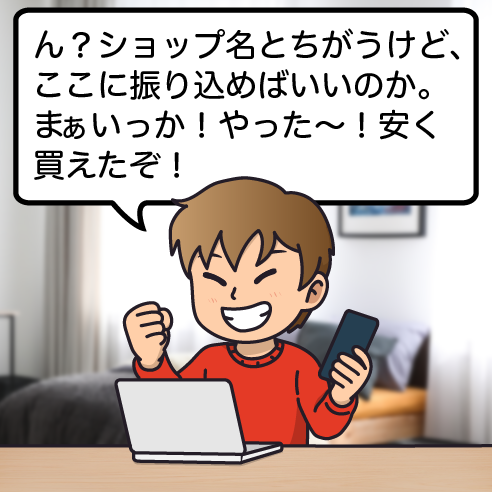 振込先としてショップや法人、代表者とは関係のない口座を指定されます。また「24時間以内の振込みであれば手数料が無料」とお得感を出して振込みを急がせることもあります。