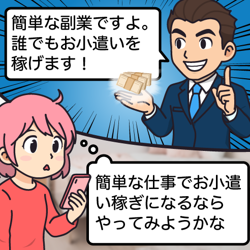 SNSや動画サイトなどの閲覧中に「高額の報酬」「簡単に稼げる」などと書かれた副業のインターネット広告やSNSなどのダイレクトメッセージで「副業をしてみませんか」と勧誘します。