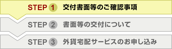 なお、外貨宅配サービスのお申込みに際し、当行所定の「外貨普通預金契約締結前交付書面」は、書面による交付にかえて、当行所定の電磁的方法により交付することとしています。お客さまはかかる交付方法についてご同意いただくことが必要です。
